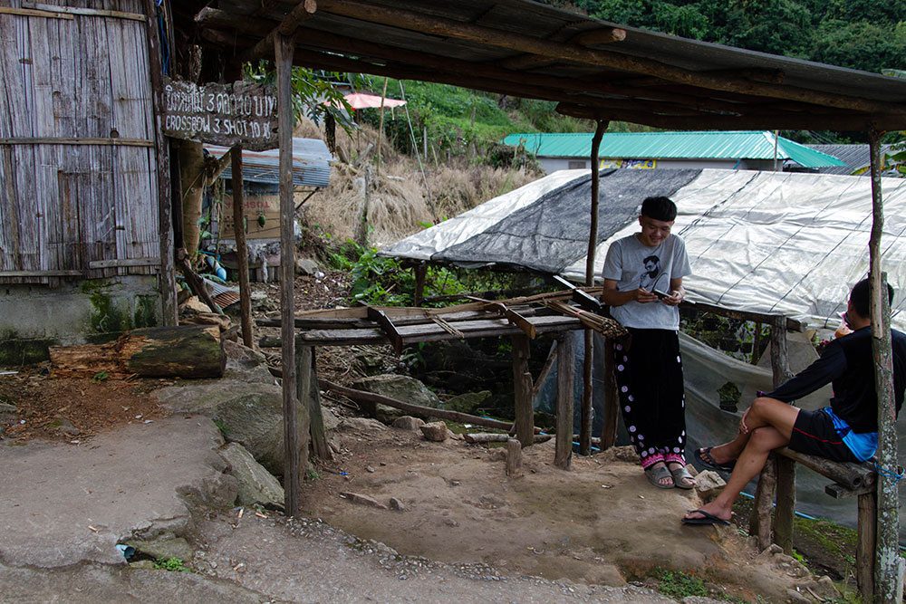 When get into the more private part of the village you will see a typical hill tribe village as you will find them all over the north of Thailand. The first image below shows a few young people who have made a crossbow shooting gallery, here you have the chance to try an original Thai crossbow.