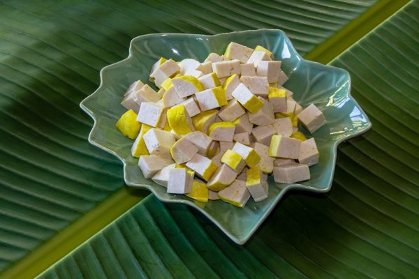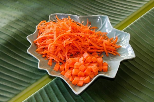 Cut 1/2 the carrot into very small cubes and the other 1/2 into small sticks. Put 1/3 of the sticks aside for decoration.