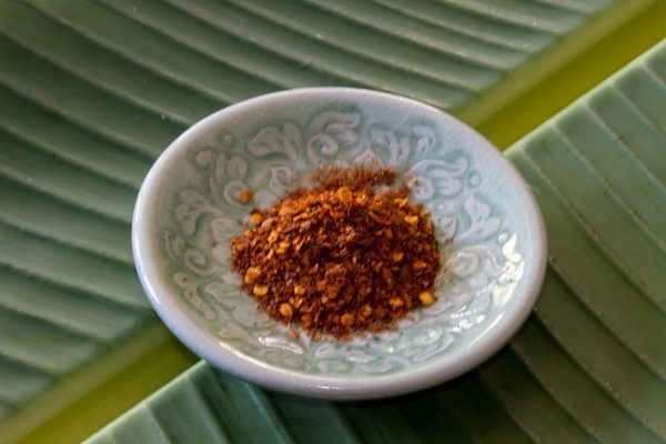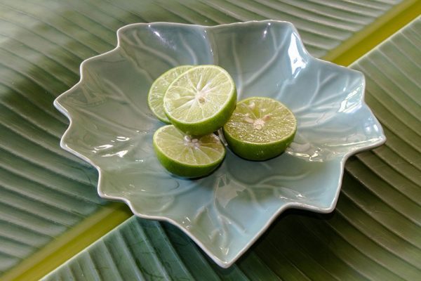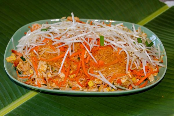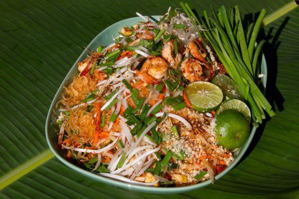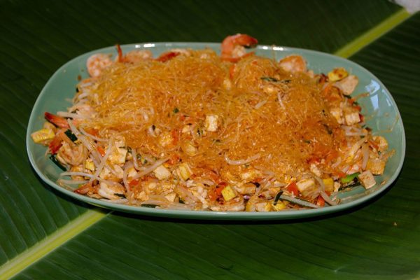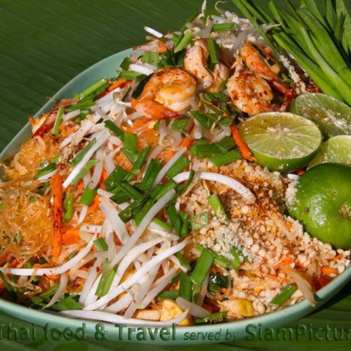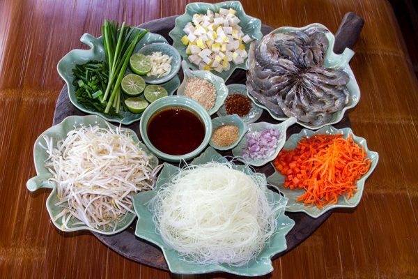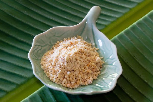To decorate the dish use some of the crushed peanuts, a little of the chilli powder, a little of the Chinese chives, the bottom part of the Chinese chives and the limes. Make sure some of the shrimps are at the top of the dish as it looks nice.