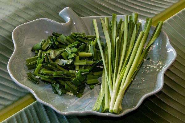 Cut the top part of the Chinese chives into small pieces and keep the bottom part, as shown on the picture.