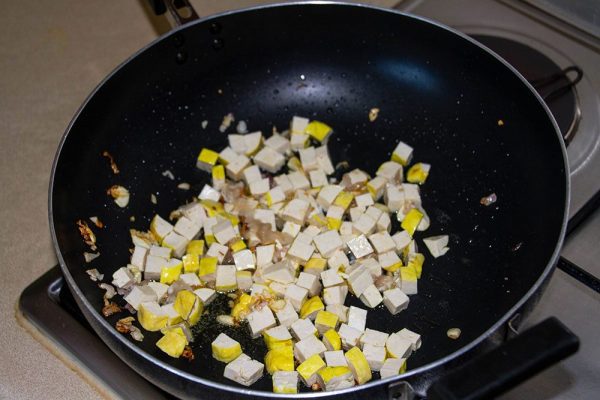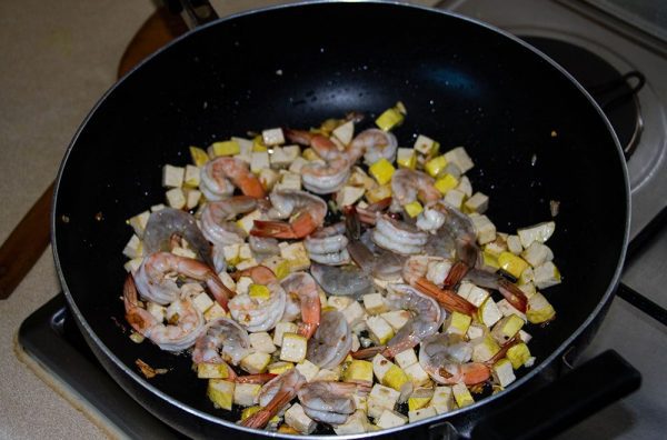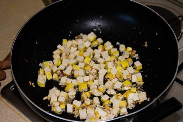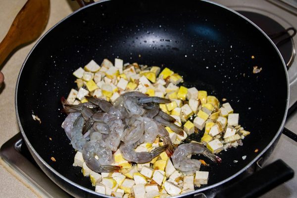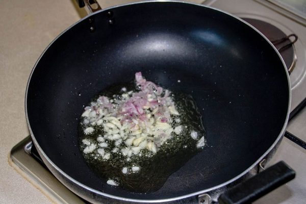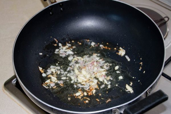 Put the garlic and the shallots in the pan and stir until the garlic starts to get golden.